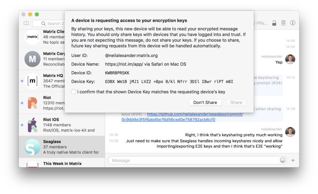 Seaglass has had a substantial rewrite to the room cache to help improve reliability and reduce crashes, better thumbnail behaviour on inline images, various tiny visual tweaks, in-window blending, support for encryption key sharing requests for E2E rooms.